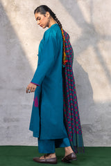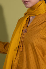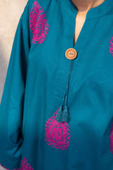 Classic-fit embroidered shirt on a textured base, with a low band neckline adorned with button and tassel detailing. Paired with solid straight culottes for a graceful finish.