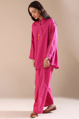 Jacquard classic-fit shirt with a low band neckline adorned with tassel detailing. Designed with subtle back pleat and fine stitching along the neckline, sleeve hems, and rounded shirt hem. Paired with a matching jacquard classic-fit shalwar.