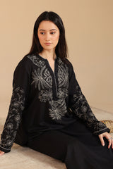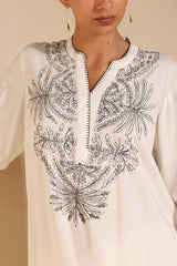 Monotone embroidered shirt with a round neckline and V-slit, finished with delicate stitch detailing along the neckline and sleeve hems. Paired with straight-fit trousers.