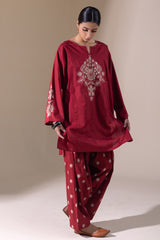 Embroidered classic-fit paneled shirt with a round neckline and V-slit, adorned with delicate stitching detail along the neckline and side slits. Paired with an embroidered classic-fit shalwar for an elegant, coordinated look.