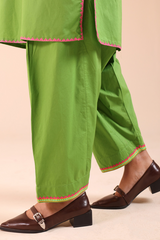 Classic-fit embroidered shirt with a round neckline and side slit, finished with delicate lace detailing. Designed with subtle puff sleeves for a relaxed silhouette. Paired with a classic-fit shalwar, finished with lace detailing along the ankle hemline.