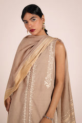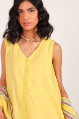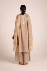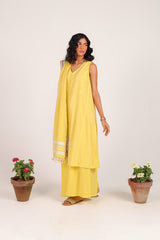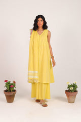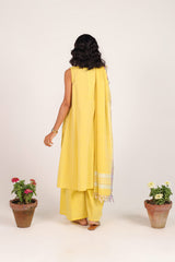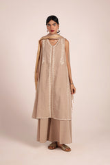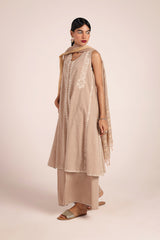 An embroidered panelled kurta features a round neckline, enhanced with delicate embroidery and Aina work. The front slits, panels, and back are beautifully adorned with detailed embroidery, while the front placket is accentuated with buttons. Paired with solid flared trousers with lace trims and a dupatta featuring golden borders and frill details for an elegant, regal look.