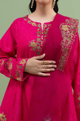 An embroidered paneled kurta on a golden-speckled base, with a round neckline and V-slit, adorned with delicate embroidery and sequin detailing. Embroidered details on the sleeves, hem, and back add richness to the silhouette. Paired with matching culottes embroidered at the hemline and and embroidered organza dupatta for a refined finish.