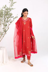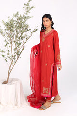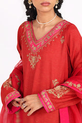 A speckle-based embroidered kurta featuring a V-neckline adorned with delicate tilla embroidery. Scattered motifs, sleeve cuffs, side chaaks, and hems echo the same intricate work. Paired with a pegged shalwar with embroidered hems and button detailing. Finished with a beautifully embroidered organza dupatta enhanced with bead tassel accents for a festive, elegant touch.
