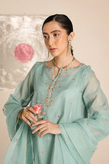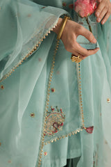 An embroidered kurta with a round neckline and V-slit, adorned with delicate embroidery and sequin work. The sleeves feature intricately detailed hems, while scattered embroidered motifs add a graceful touch. Paired with farshi shalwar featuring embroidery along the ankle hem. Comes with a soft inner for comfort and an organza dupatta adorned with chandbali motifs, gota edging, and tassels on the corners for a festive finish.