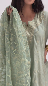 An embroidered paneled shirt with a round neckline and V-slit, adorned with delicate gold panni embroidery, tilla, resham, and mukaish detailing. Gota lace accents highlight the panels and hem. Comes with an inner for added comfort and ease. Paired with embroidered straight-fit trousers and a matching embroidered organza dupatta, finished with gota lace trimming and tassel details.