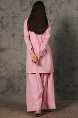 Embroidered classic-fit shirt with a round neckline, enhanced with sequin detailing and finished with buttoned sleeve slits. Paired with a coordinated farshi shalwar featuring embroidered border detailing.