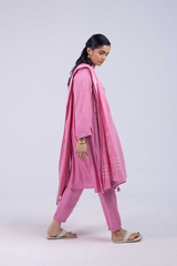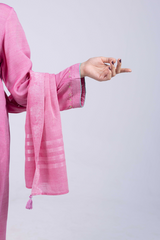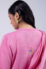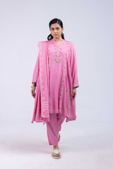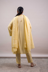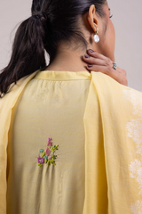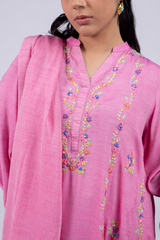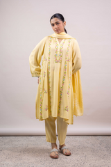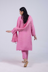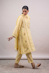 A hand-embroidered paneled shirt with a round neckline and V-slit, adorned with delicate embroidered details. Soft stitch accents on the neckline and cuffed sleeves add graceful structure. Paired with straight-fit trousers and a denier-bordered dupatta finished with tassels for a chic, composed look.
