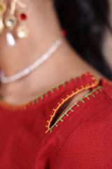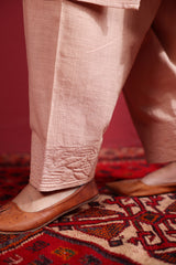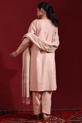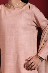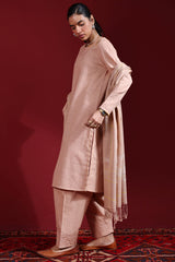 Classic-fit shirt with a round neckline and a side slit, adorned with delicate stitching along the neckline, slit, and sleeve hems. Paired with a classic-fit shalwar finished with quilted detailing at the ankle hems. Style it with a jacquard dupatta for a cohesive look.