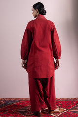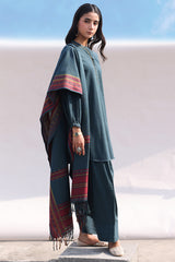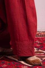 Classic-fit shirt with a low band neckline adorned with fine stitching detail. Designed with cuffed sleeves and a rounded shirt hem. Paired with a classic farshi shalwar finished with quilted detailing at the hem, and complemented with a jacquard dupatta.