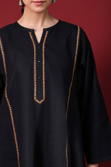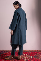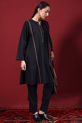 A classic paneled embroidered kurta with a round neckline and V-slit, adorned with aina work for a refined touch. Paired with straight-fit trousers. Style with a jacquard dupatta for an elegant finish.