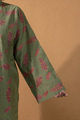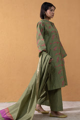 Embroidered paneled shirt with a low band neckline and a buttoned front placket. Paired with classic culottes and styled with a lurex-bordered dupatta for a refined finish.