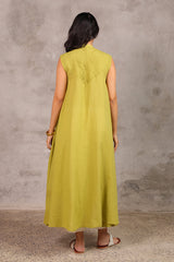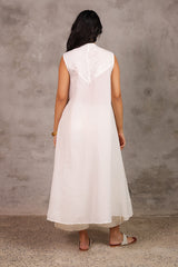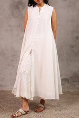 A classic-fit, long A-line schiffli dress featuring a low band neckline and loop-button detailing along the front slit. Finished with delicate lace on the sleeve hems and soft pleats at the back for a timeless look.