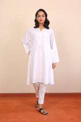 Hand embroidered white on white kurta with V neckline, cuff sleeves with pleat details.