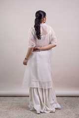 A hand-embroidered shirt with a V-neckline, adorned with tassel detailing. The intricate embroidery is further enhanced with delicate mirror work. Comes with an inner for added comfort and ease.