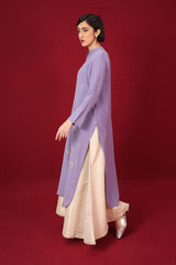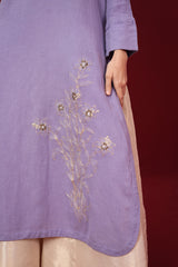 Straight-cut long kurta with a band neckline and subtle embroidery details on the neckline. The embroidered motif on the shirt is enhanced with sequin work.