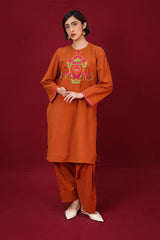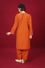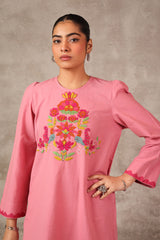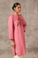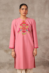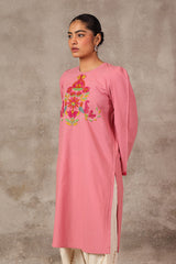 A solid-colored kurta with a round neckline, featuring delicate gulkar ralli work, and puff sleeves featuring ralli detailing on the hems for a sophisticated look.