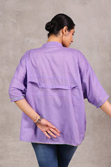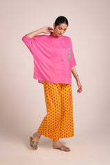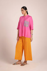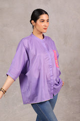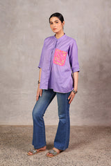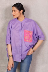 A relaxed-fit embroidered top featuring a band neckline with stitching detail on the neckline, sleeves, and hem. Designed with a drop shoulder for added ease, and a front pocket adorned with colorful, lively embroidery that adds a playful touch. Pairs effortlessly with any generation of bottoms.