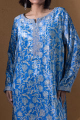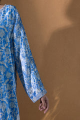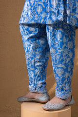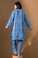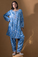 Printed velvet shirt with a round neckline and V-slit, adorned with delicate embroidered detailing along the neckline and sleeve hems. Paired with a matching printed velvet pegged shalwar, finished with embroidered borders and subtle button accents at the ankle slits.