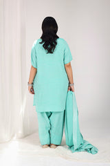 A loose fit shirt with round neckline, featuring intricate floral inspired embroidery detaling on rounded neckline all meticulously done by hand in a variety of french knots and running stitches with crochet lace detailing on sleeve hems. Paired with a solid farshi shalwar and a matching dupatta with denier borders and tassel detailing at dupatta corners.