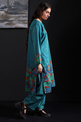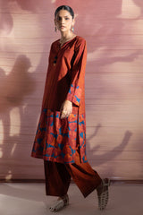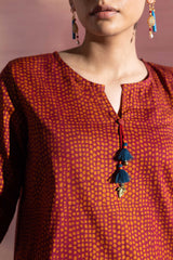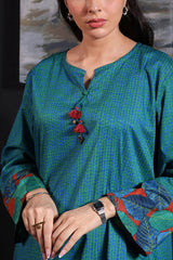 A classic-fit printed shirt with a round neckline and V-slit, adorned with delicate tassel detailing. Paired with matching printed farshi shalwar for a coordinated and stylish look.