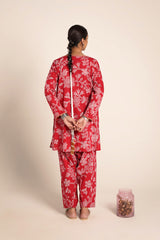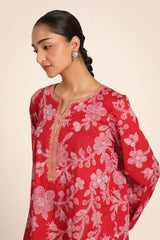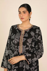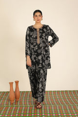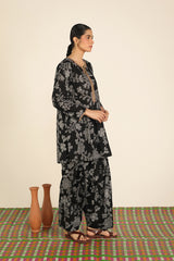 A relaxed-fit floral beadwork kurta featuring a round neckline with a V-slit, elegantly adorned with delicate embroidered details along the neckline and placket. The sleeve hems mirror this intricate embroidery, adding a refined touch. Paired with a matching printed shalwar, finished with subtle stitching details at the ankle hemline for an effortless look.