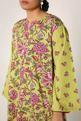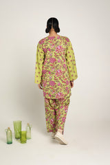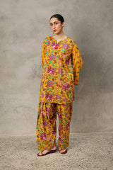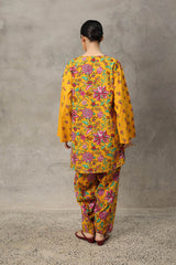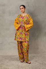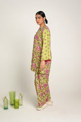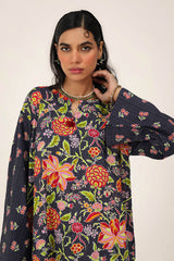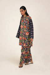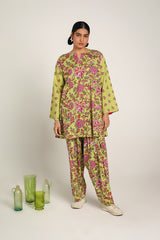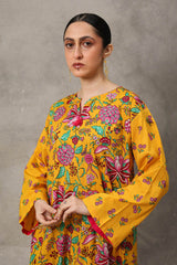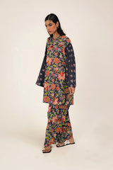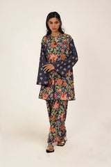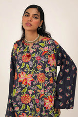 A classic floral-printed kurta features a round neckline with a V-slit, adorned with tassel details. The drop shoulder design adds to the relaxed silhouette. It is paired with a matching printed classic-fit shalwar, enhanced with stitching detail at the ankle hemline.