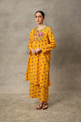 A vibrant floral-printed shirt with a round neckline and V-slit, enhanced with a striking phool-patti design on the bodice and scattered motifs all over. Paired with matching printed culottes for a cohesive look.
