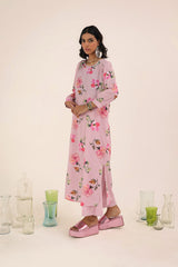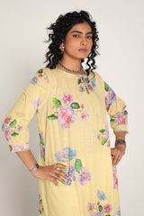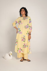 A classic loose-fit, long floral-printed kurta features a round neckline, adorned with soft gathers that create a naturally flared silhouette. The cuffed sleeves are enhanced with a delicate lace trim, adding a subtle touch of detail. Paired with solid-hued wide-leg trousers, finished with intricate lace trim for a cohesive look.