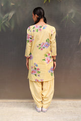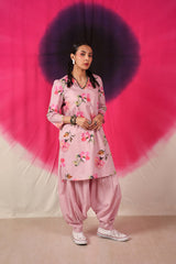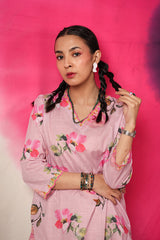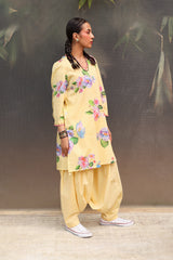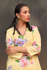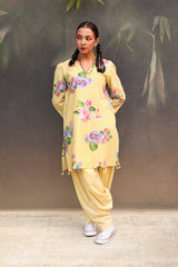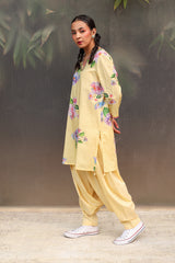 A pastel-hued, watercolor-printed kurta with a scalloped neckline, enhanced with subtle embroidered detailing and a finishing trim. The scalloped sleeve hems and neckline add a delicate, rounded touch to the design. Paired with a solid-hued, classic cowl-shaped shalwar.