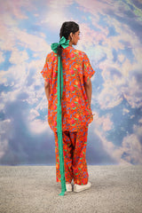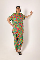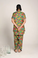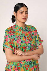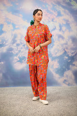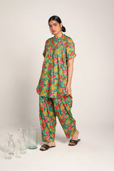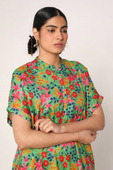 A classic-fit floral printed kurta features a band neckline, accentuated with popping color button details along the placket. The sleeve hems are subtly enhanced with delicate stitching, while the drop shoulder design adds a relaxed touch. The bodice is adored with pleats, complemented by a rounded shirt hem. Paired with a matching printed classic-fit shalwar for a complete look.