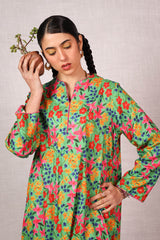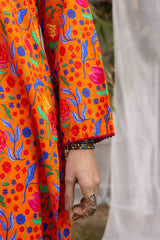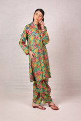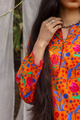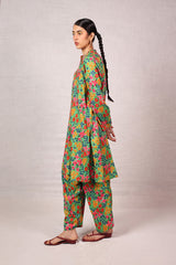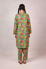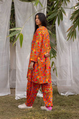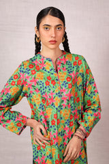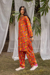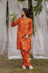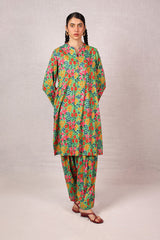 A loose fit printed kurta with round neckline with V slit, featuring piping detailing on the neckline. Paired with matching printed shalwar.