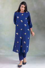 A classic-fit embroidered shirt with a round neckline and cuffed sleeves, featuring a keyhole back with a button detail. Paired with straight-fit trousers for a refined look.