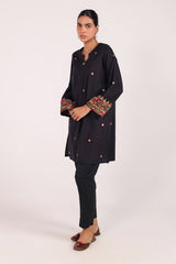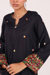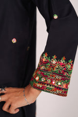 An embroidered shirt with a round neckline and V-slit, adorned with stitching details. The sleeves feature vibrant embroidery, enhanced with scattered sequin detailing, while embroidered motifs are spread all over the shirt.