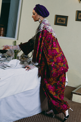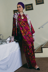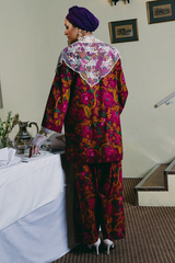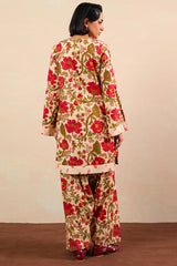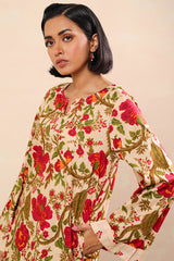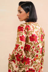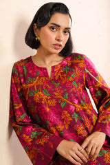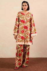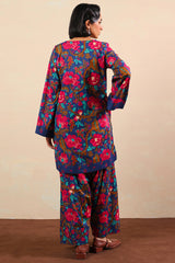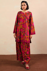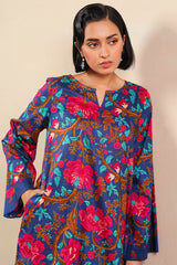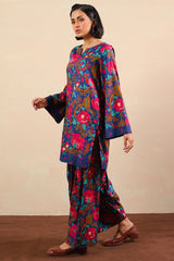 A relaxed-fit printed shirt with a round neckline and V-slit, featuring side pockets for ease. Paired with matching printed shalwar with stitching detail on the ankle hemline.