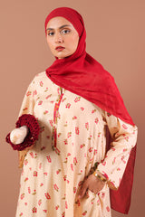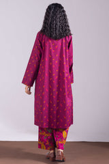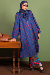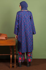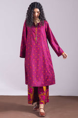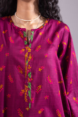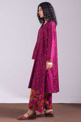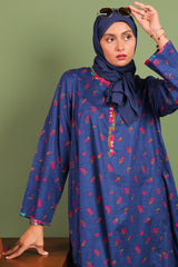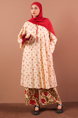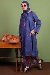 A printed paneled shirt with a round neckline and V-slit, adorned with delicate mukaish detailing along the front slit. Side pockets add functionality and ease. Paired with printed culottes.