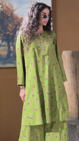 A classic printed A-line shirt with a round and V-cut neckline, adorned with delicate embroidery on the neckline and sleeve hems. Paired with matching printed culottes.
