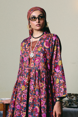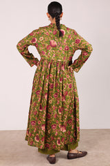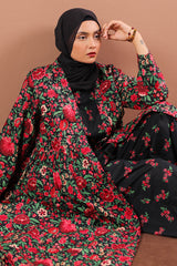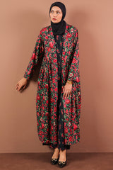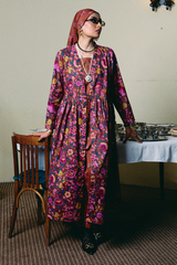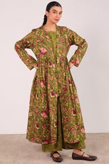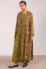 A classic-fit short printed shirt with a square neckline paired with matching culottes, creating a chic co-ord set. Styled with a long printed front-open overlay, featuring gathered detailing at the waist accented with tassel ties for a flowy, timeless look.