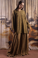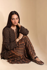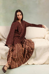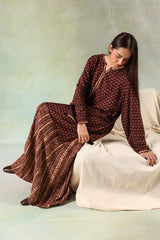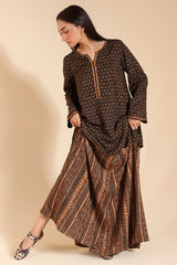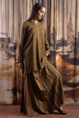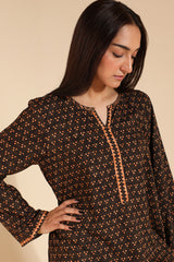 A classic-fit printed shirt with a round neckline and V-slit, adorned with bead embellishment along the slit. Paired with a printed skirt for a coordinated look.