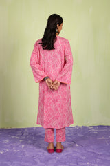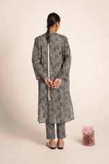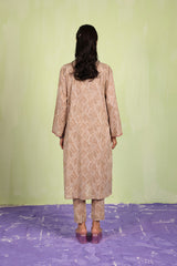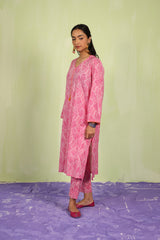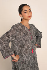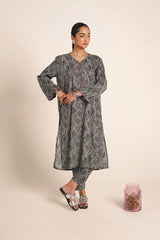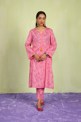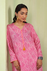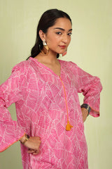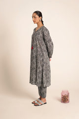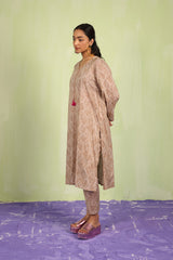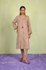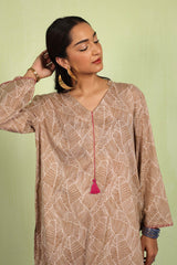 An easy-fit printed kurta featuring a band V-neckline, adorned with delicate tassel details for a touch of elegance. The sleeve hems are enhanced with fine stitching details, adding subtle texture. Paired with matching printed classic straight-fit trousers, this ensemble blends comfort with effortless style.