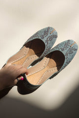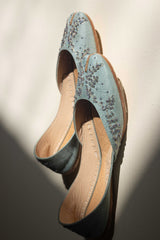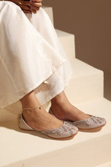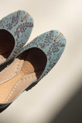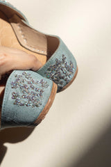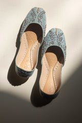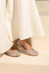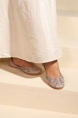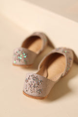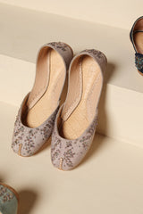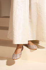 Exquisitely handcrafted khussa in rich dupion silk, adorned with hand embroidery featuring golden dori work and sequins. The khussa is lined with soft leather and finished with a leather insole, offering the perfect festive flair.