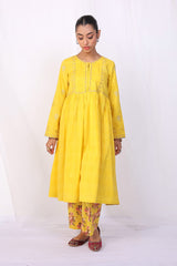 Flared dori embroidered frock with gather details, paired with printed loose fit culottes.
