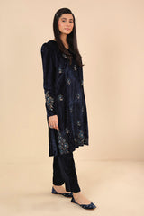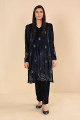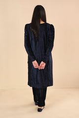 Panelled V neckline velvet shirt with puff sleeves and adorned with marorri and velvet taanka embroidery on sleeves and shirt, paired with straight fit pants.