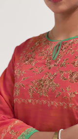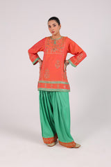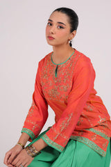 An embroidered shirt adorned with exquisite zardozi work and finished with dori piping. Gota lace along the borders and slits adds a regal touch. Comes with an inner for added comfort. Paired with a contrasting farshi shalwar featuring embroidered details on the borders.