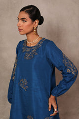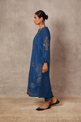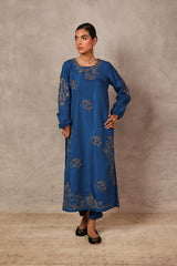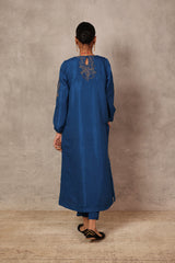 A relaxed-fit solid-hued long kurta featuring a round neckline, adorned with delicate gold embroidery and subtle sequin details. Scattered floral motifs grace the fabric, while cinched sleeves mirror the charm with embroidered accents. The back neckline highlights a keyhole design framed with gold embroidery. Paired with solid straight-fit trousers.