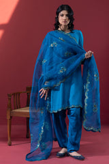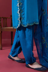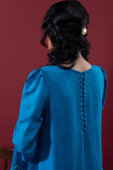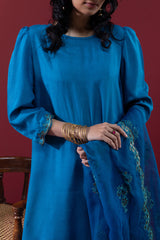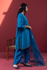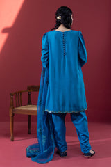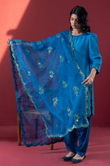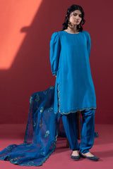 Embroidered classic-fit shirt with scalloped sleeve hems and side slits, detailed with embroidery and sequin accents. Features soft puff sleeves and loop-button detailing at the back. Paired with a pegged shalwar with button detailing along the side slit, and finished with an organza, sequin-embellished scalloped dupatta for a festive statement look.