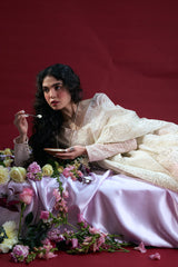 Sequin-embellished saree crafted in a sheer fabric, featuring intricate all-over detailing and softly scalloped edges. Designed to create a luminous, fluid drape. Paired with a classic-fit blouse adorned with sequin embellishment, featuring loop buttons along the sleeve slits. Comes with a matching petticoat for a complete look.