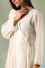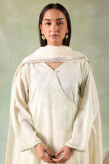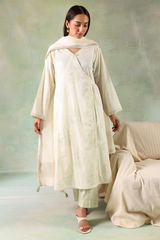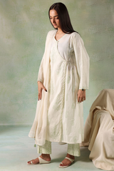 A Hand block-printed angrakha shirt adorned with mukaish button detailing and finished with gota lace along the edges for a classic appeal. Paired with block-printed straight trousers and a lurex-bordered dupatta, accentuated with gota and tassel details.