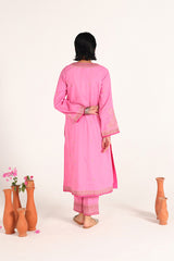 An embroidered shirt with a round neckline and V-slit, adorned with delicate embroidery and subtle sequin accents. The sleeves and hem are finished with intricate embroidery and dori pipping detailing for a refined touch. Paired with matching embroidered straight-fit trousers for a graceful, coordinated look.