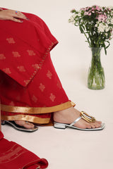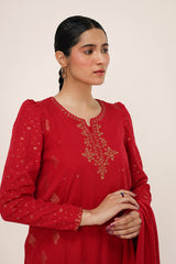 A formal embroidered shirt featuring a round neckline with a V-slit, adorned with delicate embroidery elevated by sequin work. Scattered sequins add a subtle shimmer across the front. Puff sleeves are finished with tilla and sequin accents, while the shirt border reflects matching embroidery. Paired with jacquard flared trousers finished with golden lace trim and a soft inner for added comfort. The look is completed with a jacquard dupatta, edged with gota lace.